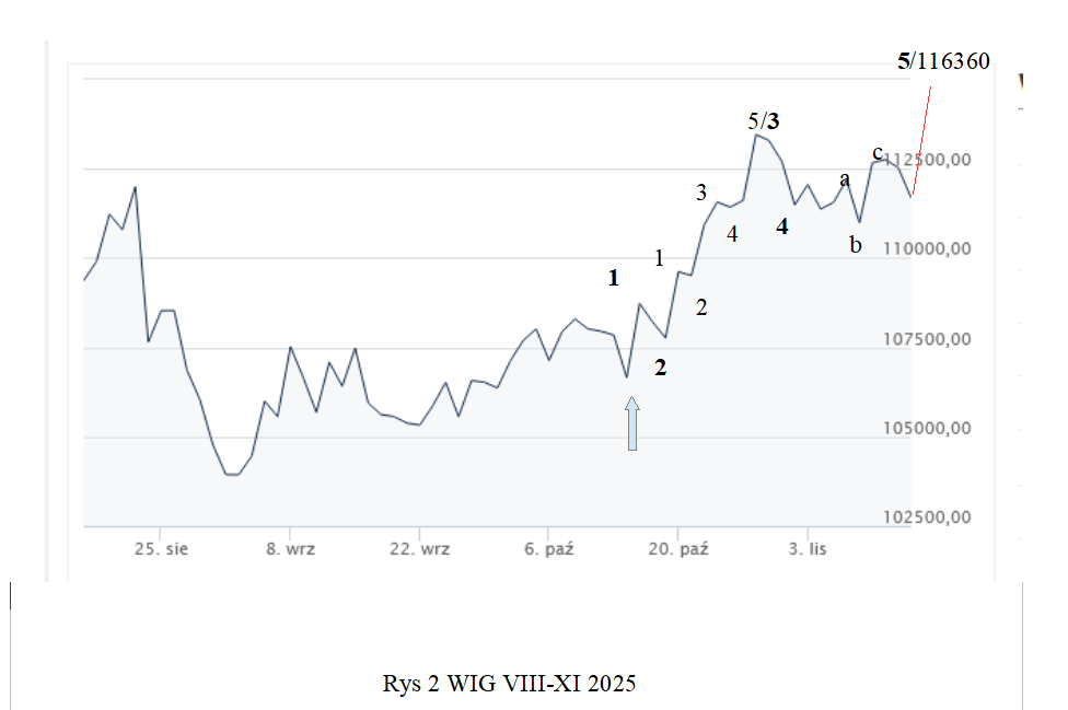 Dokładnie tak się stało. W dniu 31 X WIG zakończył notowania na poziomie 111 487 pkt. Tzn. fala „4” wypadła nieco powyżej fali „4” niższego rzędu .