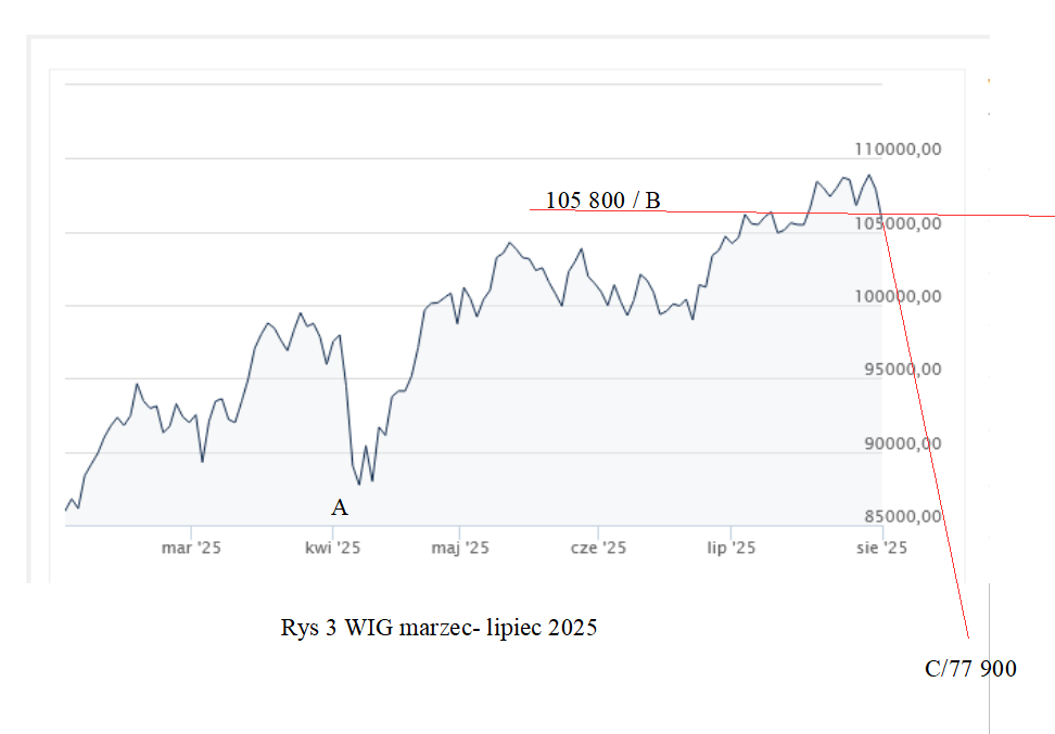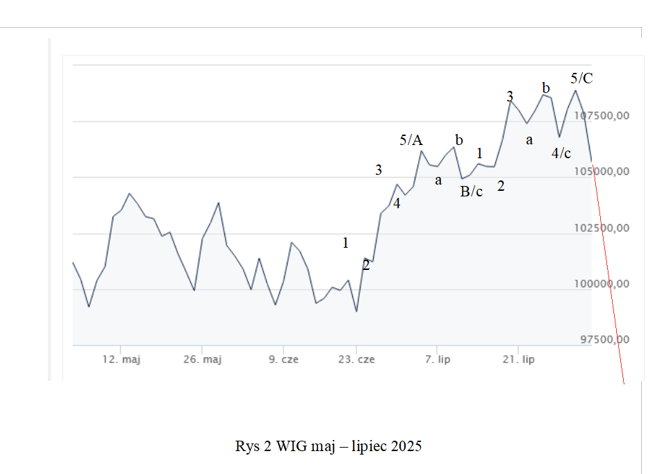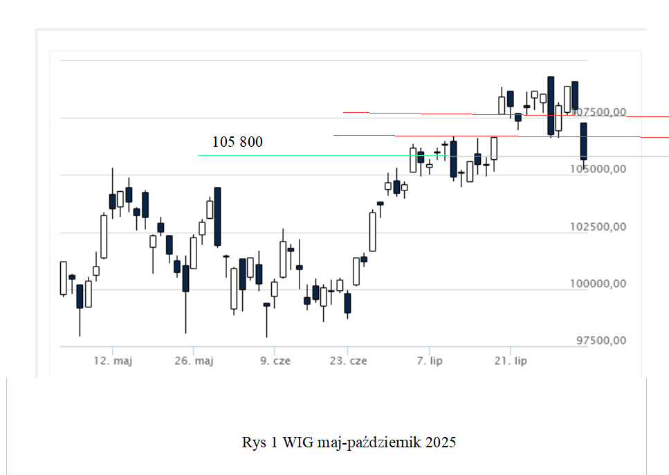 Na poniższym rysunku przedstawiłem wykres WIG za okres marzec- lipiec 2025.
