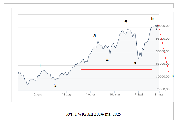 Wynika z niego że w chwili obecnej jesteśmy na etapie korekty tzw. piątki Eliotta która wyrysowała się na indeksie WIG od grudnia 2024 do kwietnia 2025.